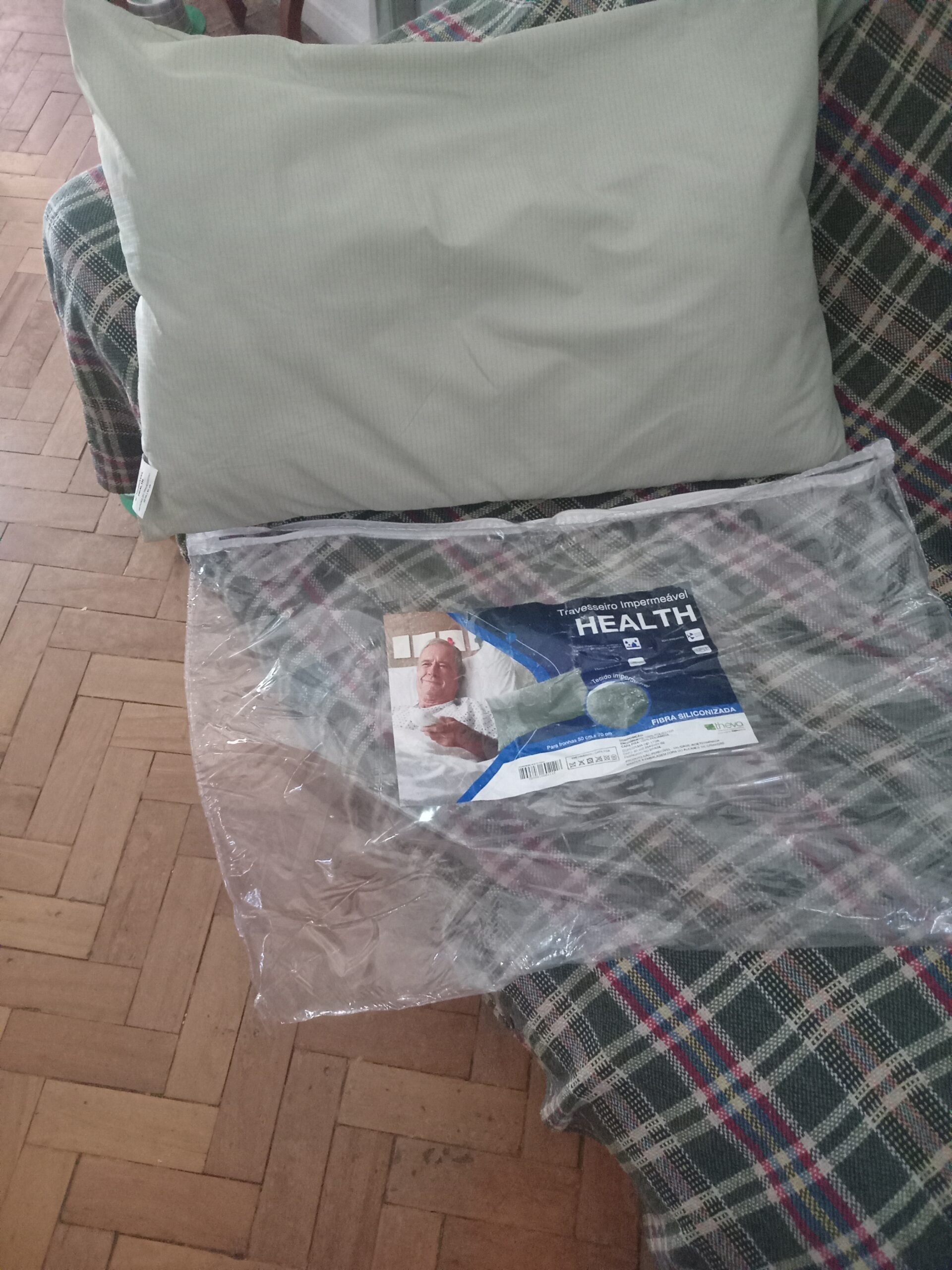 Travesseiro impermeavel Health de fibra siliconizada, novo, na embalagem. Com um design elegante, o travesseiro e macio e comfortavel, proporcionando boas noite de sono.